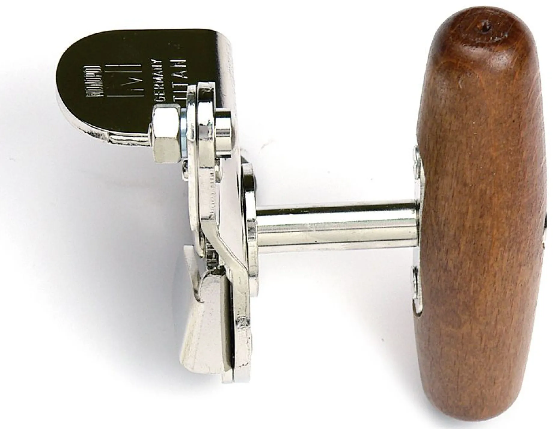 Apriscatole e barattoli dalle dimensioni gastronomiche per uso professionale, con lama e rotella in acciaio e impugnatura in legno.
