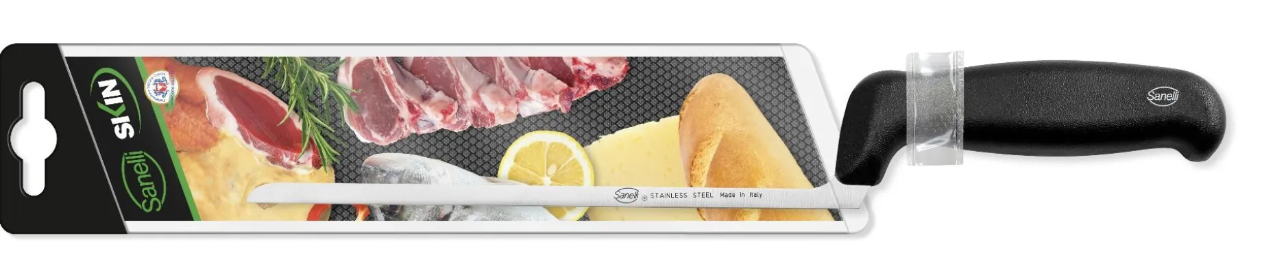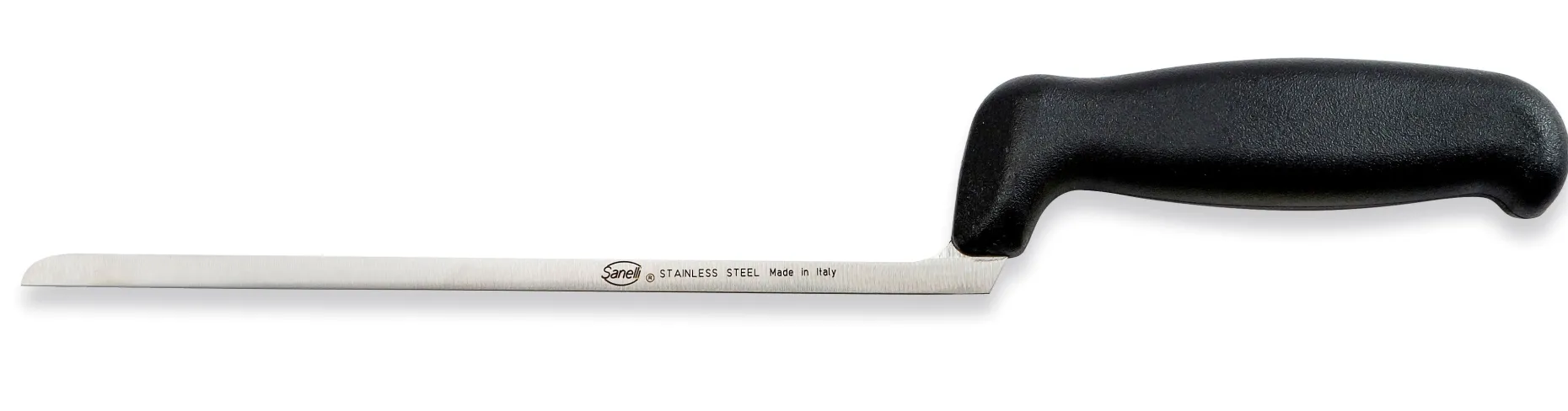 Coltello adatto per il taglio di formaggi morbidi, la lama sottile consente al formaggio di non attaccarsi (es. Gorgonzola, Taleggio, Brie).