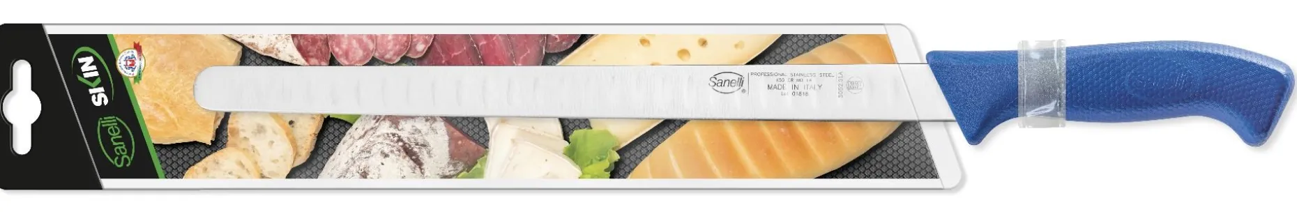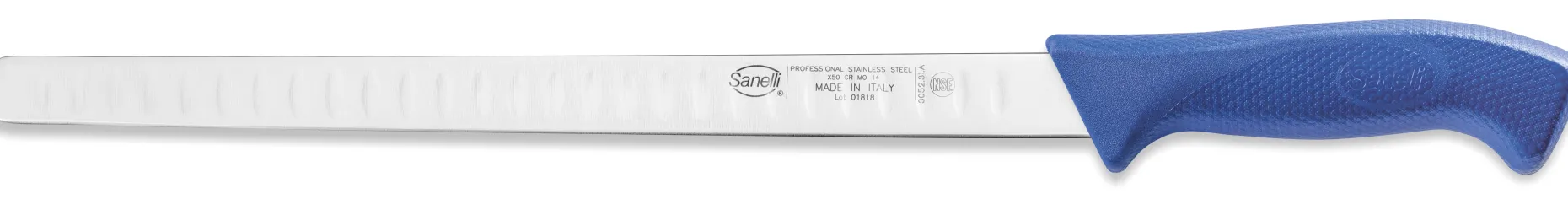 Coltello a lama flessibile e olivata per facilitare il distacco della fetta. Ideale per salmone affumicato.