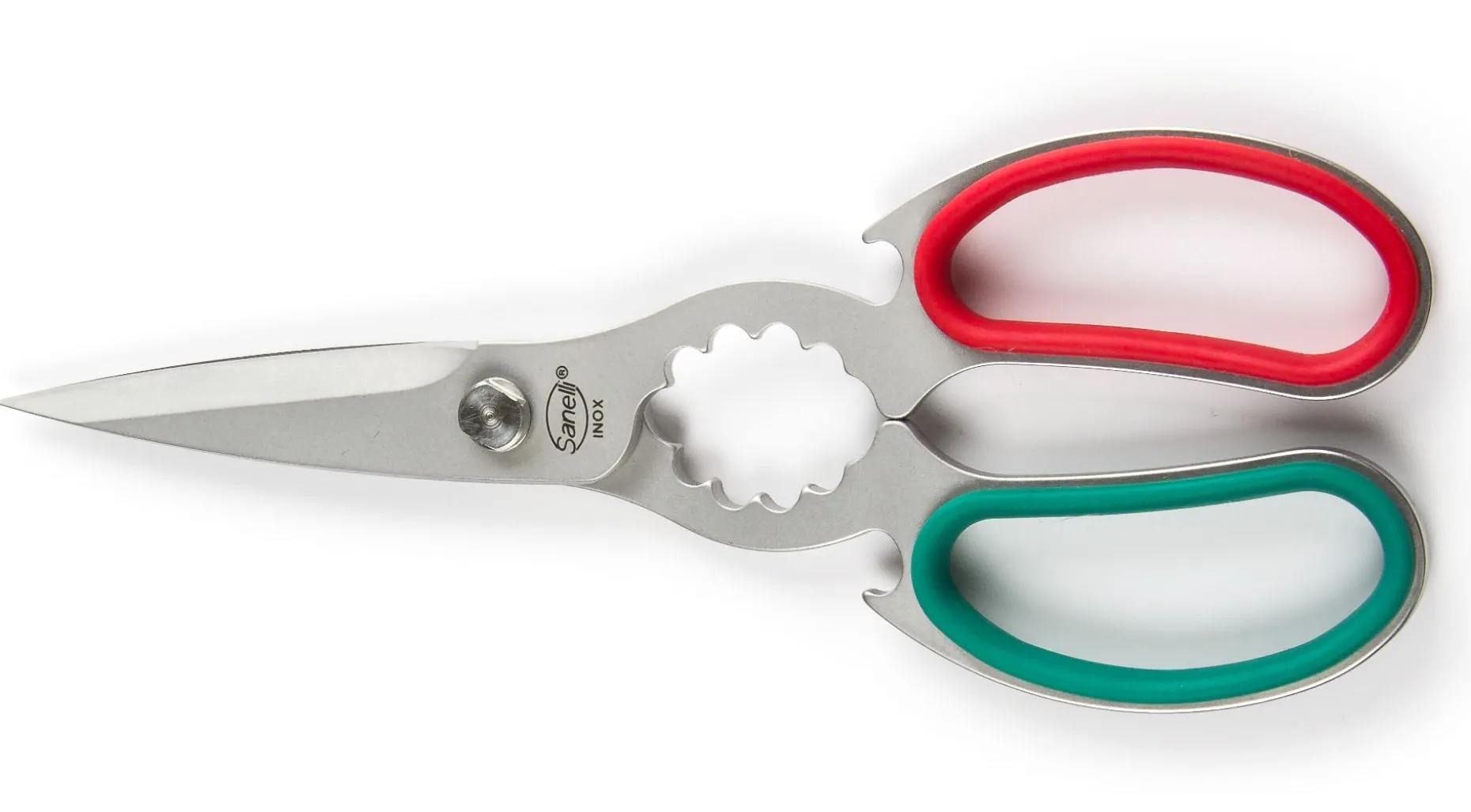 Forbici da cucina Inox disegnata al computer e tagliata al laser, i due pezzi sono assemblati con vite Inox.