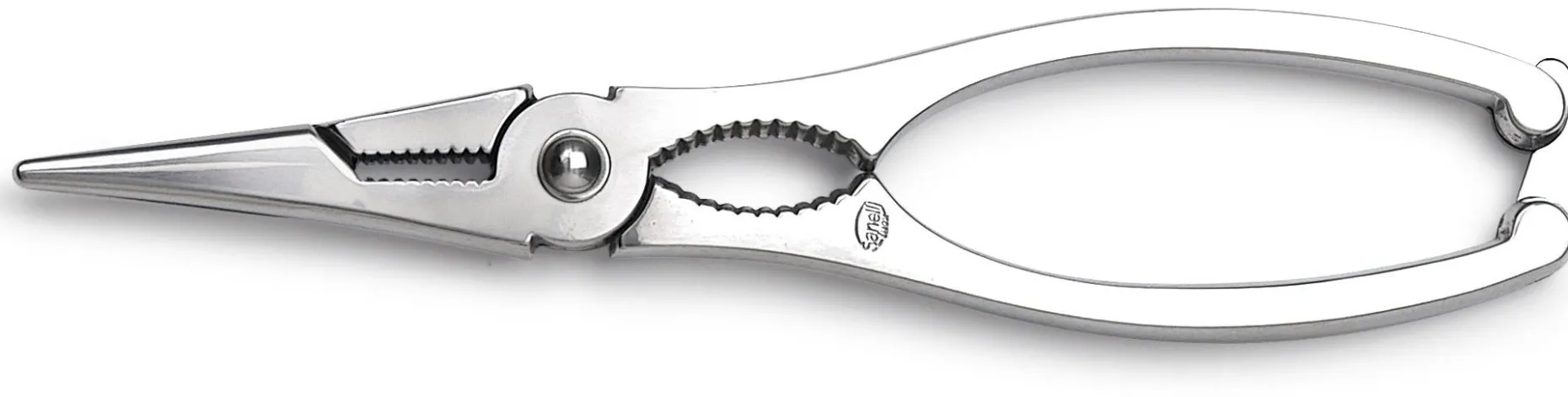Pinza in acciaio Inox lucido utilizzata per levare le chele da gamberi e crostacei in genere.