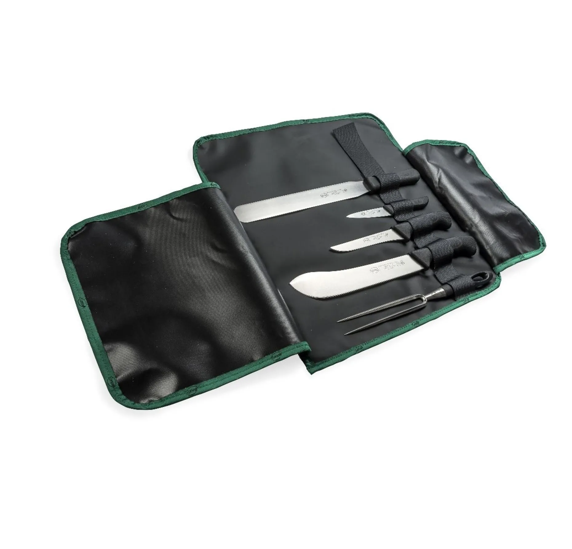 Rotolo con pratico velcro per alloggio di 5/6 coltelli e accessori con interno lavabile. Contiene gli strumenti indispensabili per il BBQ: