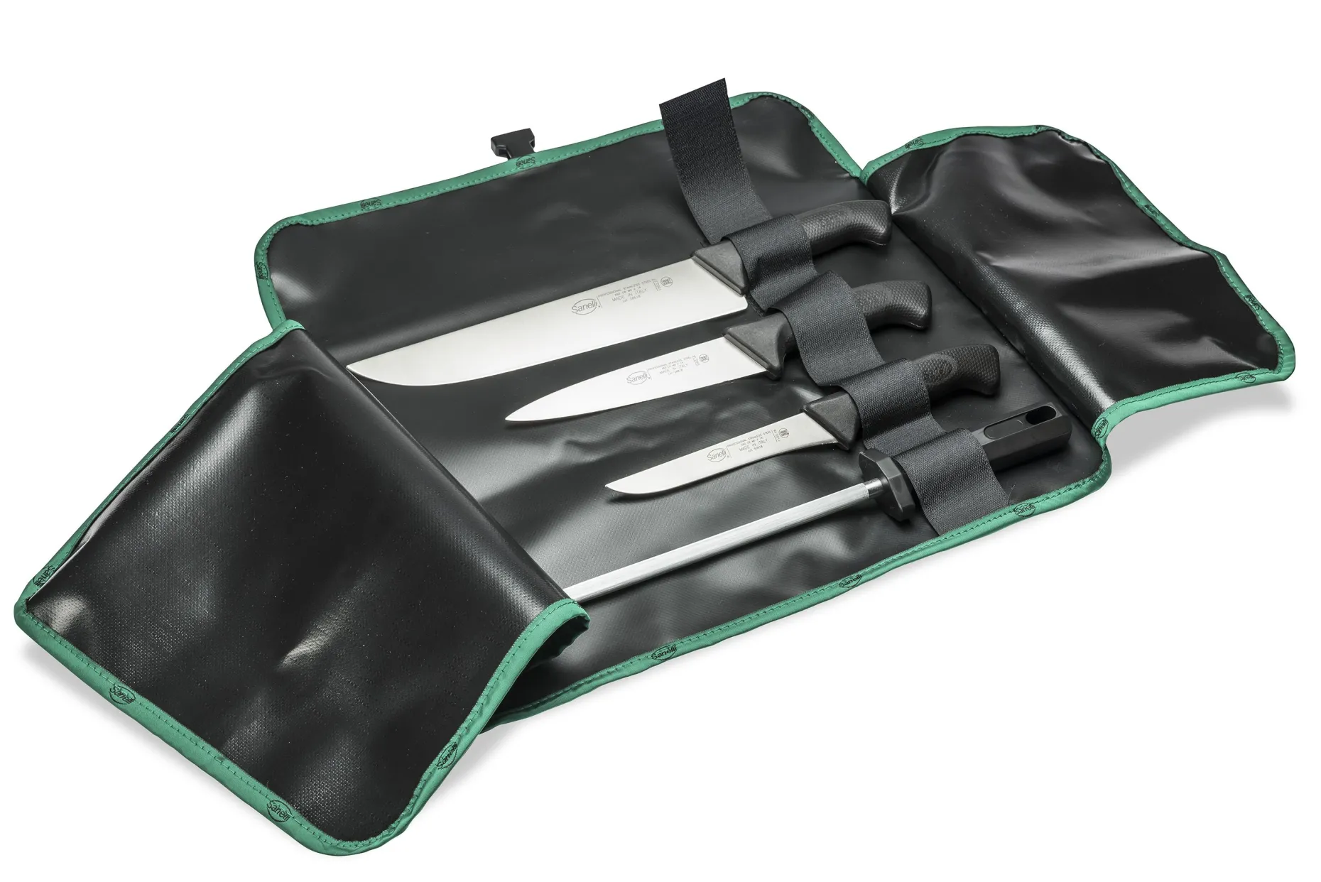 Rotolo con pratico velcro per alloggio di 4 coltelli indispensabili per il macello.