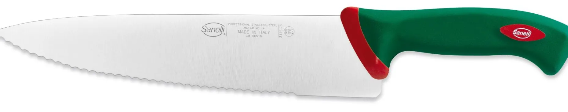 Coltello trinciante rigido ideale per il taglio di blocchi di cioccolato, verdura e frutta coriacea (es. ananas, cardi). La lama seghettata è ideale per affettare facilmente tutti i tipi di pani anche i piu croccanti. Manico ergonomico in doppio stampaggio e materiale antiscivolo con additivo Biomaster.